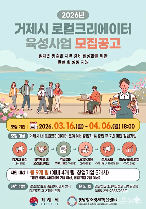 [(경남)조은뉴스=이재훈 기자] (재)경남창조경제혁신센터(대표이사 노충식)가 거제시 내 창업생태계 활성화를 위해 ‘2026년 거제시 로컬크리에이터 육성사업’ 참여자를 4월 6일(월) 오후 6시까지 모집한다고 밝혔다.