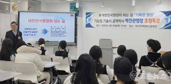 [(부산)조은뉴스=이재훈 기자] 대한민국명장회 부산지회(지회장 박진관 명장)는 지난 26일 오후, 부산국제영화고 재학생들을 대상으로 '대한민국명장이 되는 길'의 주제로 직업진로 지도 특강을 실시했다.