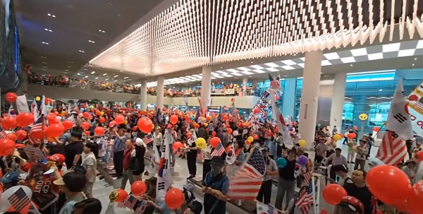 인천공항에는 수천 명의 자유민주주의를 외치는 시민들이 손에 태극기와 성조기를 들고 모여 “윤 어게인” “CCP 아웃” “USA” 등을 연호하며 모스 탄 대사를 환영했다.